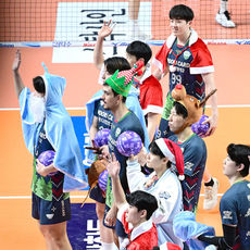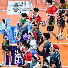 2025.12.21 15: 16장충 홈 팬들에게 인사 전하는 우리카드, '크리스마스 분위기 물씬'