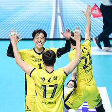 2025.12.21 16: 20접전 끝 3세트 가져온 KB손해보험 비예나-이학진, '싱글벙글'