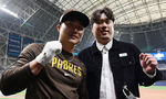 [OSEN=고척돔, 지형준 기자] 20일 오후 서울 고척스카이돔에서 ‘MLB 월드투어 서울 시리즈’ LA 다저스와 샌디에이고 파드리스의 경기가 열렸다. 샌디에이고 파드리스 김하성과 한화 류현진이 인사를 나누고 있다. 2024.03.20 /jpnews