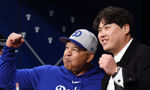 [OSEN=고척돔, 지형준 기자] 20일 오후 서울 고척스카이돔에서 ‘MLB 월드투어 서울 시리즈’ LA 다저스와 샌디에이고 파드리스의 경기가 열렸다. 다저스 데이브 로버츠 감독과 한화 류현진이 인사를 나누고 포즈를 취하고 있다. 2