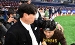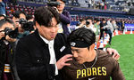 [OSEN=고척돔, 지형준 기자] 20일 오후 서울 고척스카이돔에서 ‘MLB 월드투어 서울 시리즈’ LA 다저스와 샌디에이고 파드리스의 경기가 열렸다. 다저스에서 활약한 한화 류현진이 샌디에이고 김하성과 인사를 나누고 있다. 2024.