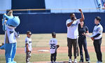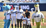[OSEN=창원, 이석우 기자] 23일 창원 NC파크에서 2024 신한 SOL 뱅크 KBO 리그 NC 다이노스와 두산 베어스의 개막 경기가 열렸다. 스크럭스와 가족들이 시구를 마치고 박민우와 기념촬영을 하고 있다. 2024.03.23 / foto0307@osen.co.kr