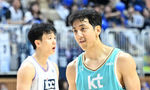 [OSEN=수원, 이대선 기자] 27일 오후 경기도 서수원칠보체육관에서 프로농구 챔피언결정전 1차전 수원 KT 소닉붐과 부산 KCC 이지스의 경기가 열렸다.2쿼터 KT 한희원이 버저비터를 성공시키고 송영진 감독과 환호하고 있다. 2024.4.27