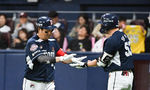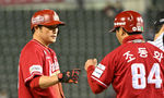 [OSEN=잠실, 이대선 기자] 7일 오후 서울 잠실야구장에서 ‘2024 신한 SOL Bank KBO리그’ LG 트윈스와 SSG 랜더스의 경기가 열렸다.5회초 2사 2루에서 폭투를 틈 타 3루에 안착한 SSG 이지영이 조동화 코치와 하이파이브를 하고 있다. 2024.