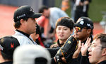 [OSEN=수원, 지형준 기자] 6일 오후 수원 KT위즈파크에서 ‘2024 신한 SOL BANK KBO리그’ KT 위즈와 한화 이글스의 경기가 열렸다.이날 KT는 엄상백, 한화는 류현진이 선발로 나섰다.4회말 수비를 마치고 한화 김경문 감독이 선수들을