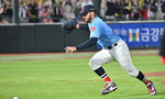 [OSEN=잠실, 조은정 기자]5일 오후 서울 잠실구장에서 ‘2025 신한 SOL Bank KBO리그’ LG 트윈스와 두산 베어스의 경기가 열렸다.LG는 손주영, 두산은 최승용을 선발로 내세웠다.7회말 2사 1루 두산 유격수 이유찬이 LG 문성주의 내야안
