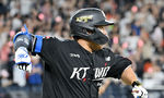 [OSEN=대전, 민경훈 기자] 7일 대전 한화생명볼파크에서 ‘2025 신한 SOL Bank KBO리그’ 한화 이글스와 KT 위즈의 경기가 열렸다.홈팀 한화는 와이스, KT는 고영표를 선발로 내세웠다.9회초 1사 주자 2루 KT 강백호가 좌월 역전 투런 홈런