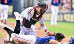 [OSEN=잠실, 조은정 기자]9일 오후 서울 잠실구장에서 ‘2025 신한 SOL Bank KBO리그’ LG 트윈스와 한화 이글스의 경기가 열렸다.LG는 치리노스, 한화는 엄상백을 선발로 내세웠다.1회초 1사 1,3루 한화 노시환 땅볼 때 LG 포수 박동원이