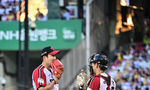 [OSEN=잠실, 조은정 기자]10일 오후 서울 잠실구장에서 ‘2025 신한 SOL Bank KBO리그’ LG 트윈스와 한화 이글스의 경기가 열렸다.LG는 손주영, 한화는 문동주를 선발로 내세웠다.4회초 2사 2,3루 위기에 LG 손주영이 이주헌 포수와 대화