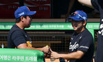 [OSEN=잠실, 조은정 기자]10일 오후 서울 잠실구장에서 ‘2025 신한 SOL Bank KBO리그’ LG 트윈스와 한화 이글스의 경기가 열린다.LG는 손주영, 한화는 문동주를 선발로 내세웠다.한화 류현진, LG 박동원이 인사를 나누고 있다. 202
