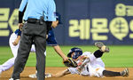 [OSEN=잠실, 지형준 기자] 12일 서울 잠실구장에서 ‘2025 신한 SOL Bank KBO리그’ 두산 베어스와 NC 다이노스의 경기가 열렸다.두산은 콜어빈, NC는 김녹원이 선발로 나섰다.8회말 2사 1루에서 두산 여동건이 NC 김주원에 태그아웃 당하