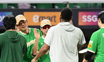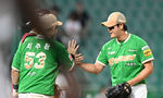 [OSEN=인천, 이대선 기자] 키움은 14일 인천 SSG랜더스필드에서 열린 SSG 랜더스와의 맞대결에서 2대0으로 승리했다.경기 종료 후 키움 설종진 감독 대행이 알칸타라와 승리의 기쁨을 나누고 있다. 2025.08.14 /sunday@osen.co.kr