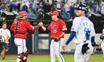 [OSEN=인천, 이대선 기자] 키움은 14일 인천 SSG랜더스필드에서 열린 SSG 랜더스와의 맞대결에서 2대0으로 승리했다.경기 종료 후 키움 조영건이 김건희와 승리의 기쁨을 나누고 있다. 2025.08.14 /sunday@osen.co.kr