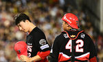 [OSEN=잠실, 지형준 기자] 16일 서울 잠실구장에서 ‘2025 신한 SOL Bank KBO리그’ 두산 베어스와 KIA 타이거즈의 경기가 열렸다.두산은 최승용, KIA는 이의리를 선발로 내세웠다.9회말 1사 만루에서 KIA 정해영이 교체되고 있다. 2025.08.16.
