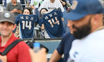 [OSEN=창원, 이석우 기자] 22일 창원NC파크에서 2025 신한 SOL 뱅크 KBO 리그 NC 다이노스와 롯데 자이언츠의 경기가 열렸다. 홈팀 NC는 신민혁이, 방문팀 롯데는 박세웅이 선발 출전했다. 전 NC 다이노스 테임즈 팬들이 유니폼을 들고