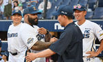 [OSEN=창원, 이석우 기자] 22일 창원NC파크에서 2025 신한 SOL 뱅크 KBO 리그 NC 다이노스와 롯데 자이언츠의 경기가 열렸다. 홈팀 NC는 신민혁이, 방문팀 롯데는 박세웅이 선발 출전했다. 전 NC 다이노스 테임즈가 코치들과 만나 인사를