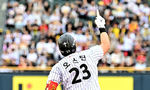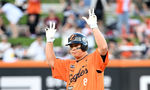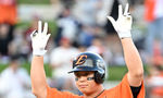 [OSEN=대전, 이대선 기자] 13일 오후 대전 한화생명볼파크에서 2025 신한 SOL Bank KBO리그 한화 이글스와 키움 히어로즈의 경기가 열렸다.한화는 폰세, 키움은 하영민을 선발 투수로 내세웠다.4회말 2사 1루에서 한화 노시환이 우전 안