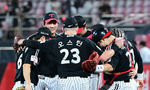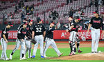 [OSEN=수원, 최규한 기자] 16일 수원 KT위즈파크에서 ‘2025 신한 SOL Bank KBO리그’ KT 위즈와 LG 트윈스의 경기가 열렸다.이날 경기는 혈투 끝에 방문팀 LG가 10-6 승리를 거뒀다.경기를 마치고 승리한 LG 선수들이 인사를 나누고 있다. 2