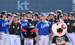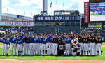 [OSEN=수원, 조은정 기자]21일 수원 KT위즈파크에서 ‘2025 신한 SOL Bank KBO리그’ KT 위즈와 삼성 라이온즈의 경기에 앞서 삼성 오승환의 은퇴 투어 행사가 진행됐다.삼성 오승환이 양팀 선수단과 포즈를 취하고 있다. 2025.09.21 /cej@osen
