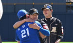[OSEN=수원, 조은정 기자]21일 수원 KT위즈파크에서 ‘2025 신한 SOL Bank KBO리그’ KT 위즈와 삼성 라이온즈의 경기에 앞서 삼성 오승환의 은퇴 투어 행사가 진행됐다.삼성 오승환이 KT 우규민과 포옹하고 있다. 2025.09.21 /cej@osen.co.kr