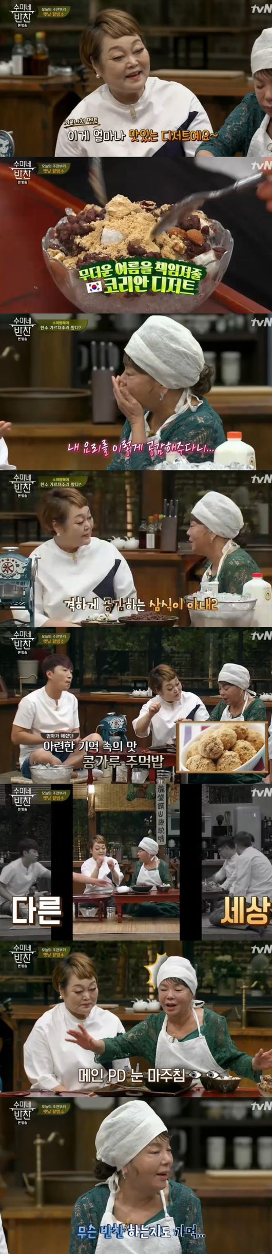 본격적으로 더위를 날려줄 팥빙수부터 만들기로 했다. 김수미와 이혜정은 추억의 팥빙수 기계를 보면서, 70년대 추억팔이를 시작했다. 당시 5원이었다면서, 남은 콩가루로 주먹밥을 해먹던 얘기까지 나왔고, 수다 삼매경에 빠졌다. 김수미는 "우리 얘기가 잘 통한다"고 좋아했고, 이혜정은 "너무 옛날 얘기라 그런다"며 마치 두 사람만 다른 세상에 있는 듯 수다삼매경에 빠졌다.