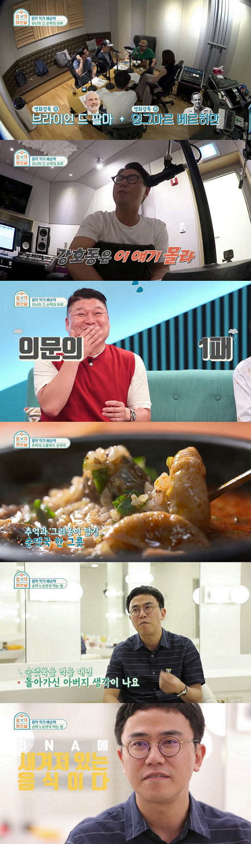 이날 방송에서는 아버지에 대한 추억과 그리움이 담긴 배순탁의 소울푸드 ‘순댓국’ 혼밥이 그려진다. 밤새 원고 마감을 마친 배순탁은 순댓국집으로 향했다. 배순탁은 순댓국이 돌아가신 아버지에 대한 추억이 얽힌 소울 푸드라고 밝히며 아버지와 함께 했던 어려웠던 시절에 대한 이야기를 공개, “순댓국은 내 DNA에 새겨진 음식”이라고 표현하며 감동을 안겼다. 배순탁이 남긴 잔잔한 여운에 홍윤화는 눈물을 보였고, 강호동과 김영철 역시 각각 풀빵과 옥수수라는 부모님에 대한 추억을 떠올리며 감상에 잠겼다.