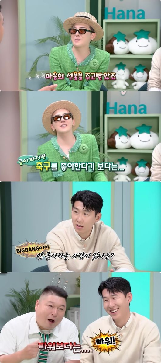 손흥민도 지드래곤과 빅뱅에 대한 애정이 남달랐다. 손흥민은 빅뱅을 좋아하냐는 질문에 “안 좋아하는 사람이 있나요? 만나서도 엄청 많이 이야기했다”라며, ‘최애곡’의로 ‘파워(PO₩ER)’를 꼽기도 했다. 강호동은 “사실은 나도 ‘파워’도 매일 듣고 나도 향수 되게 좋아한다”라고 두 사람 사이를 부러워하기도 했다.