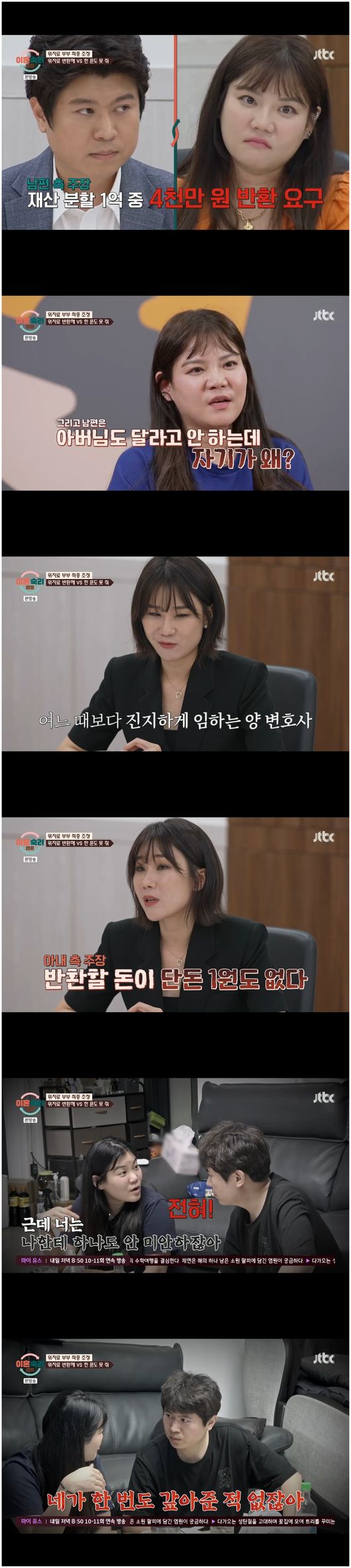 오히려 철두철미하게 살아왔던 아내는 "줄 돈 없다. 더 받아내고 싶다"는 입장이었다. “충분히 잘 들었고요, 저희는 반환할 돈이 1원도 없습니다. 코인하면서 개인 채무까지 포함을 했는데, 채무가 분할 대상이 될 때는 부부 공동 재산이 되어야 한다. 이건 남편 독단적인 발생 채무다. 이건 논외다”라며 혼란이 가중될 문제를 제거한 후 “그리고 아내 소득이 더 많다. 남편 150만 원 생활비 중 100만 원은 시아버지 채무로 사용했다. 그럼 아내는 너무 억울하다. 1억 원은 모자라지 않다. 오히려 저희가 더 받아야 한다”라며 공격했다.