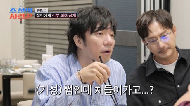 그런가 하면, 윤정수의 결혼을 믿지 못하던 '찐친즈' 배우 임형준, 가수 배기성과의 청첩장 모임도 공개됐다. 마침내 윤정수의 친구들과 만난 원진서는 "저도 (결혼을) 친한 친구 세 명한테만 이야기했었다. 배신감 든다는 친구도 있었다"라면서 "(윤정수를) 소개해달라고 할까 봐..."라고 그동안 윤정수와의 결혼을 비밀에 부친 이유를 밝혔다.