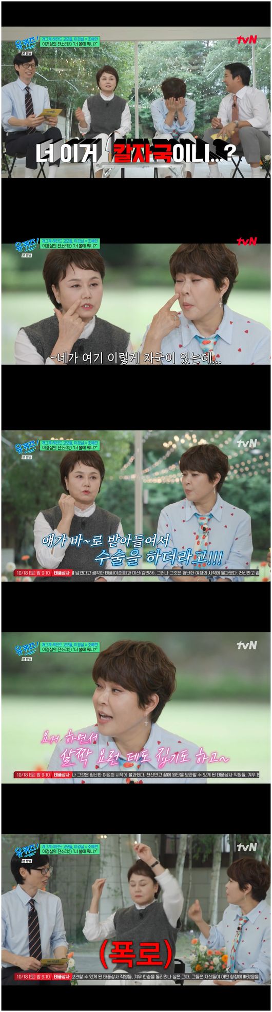 이경실은 “옛날에 조혜련을 처음 볼 때 멀리서 오는데 뺨에 자국이 있었다. 나는 그게 칼자국이냐고 물었다. 그런데 그게 개에 물린 자국이었다”라면서 “나는 그것 때문에 조혜련이 강하게 보여서 수술하길 권했다. 그랬더니 바로 수술을 받았다”라며 조혜련이 참 선하다고 말했다. 조혜련은 “개에 물린 거 수술하면서 눈도 좁 집고 그랬다”라고 말했고 이경실은 “그런 것도 하고 이마도 하고 여러 가지했지”라며 한 수 더 받아쳐 조혜련을 당황하게 했다.