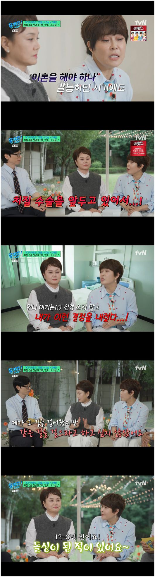 조혜련 또한 이혼 과정에서 큰 시련을 겪었다. 이혼을 아예 포기할 생각까지 했던 그는 마침내 결심 후 이경실에게 알렸다고 한다. 하필 치질 수술을 피할 수 없어서 이경실을 병원으로 부른 조혜련. 조혜련은 “하필 그때 치질 수술을 앞두고 입원을 했다. 조치를 취한다고 해도 수술을 피할 수 없었다. 피할 수가 없었다. 그래서 이경실이 수술 전날 병원에 와 줬다”라면서 “치질 수술 전날이라 자세도 엉거주춤했는데, 이혼 결정을 내렸다고 말했다”라고 말했다.