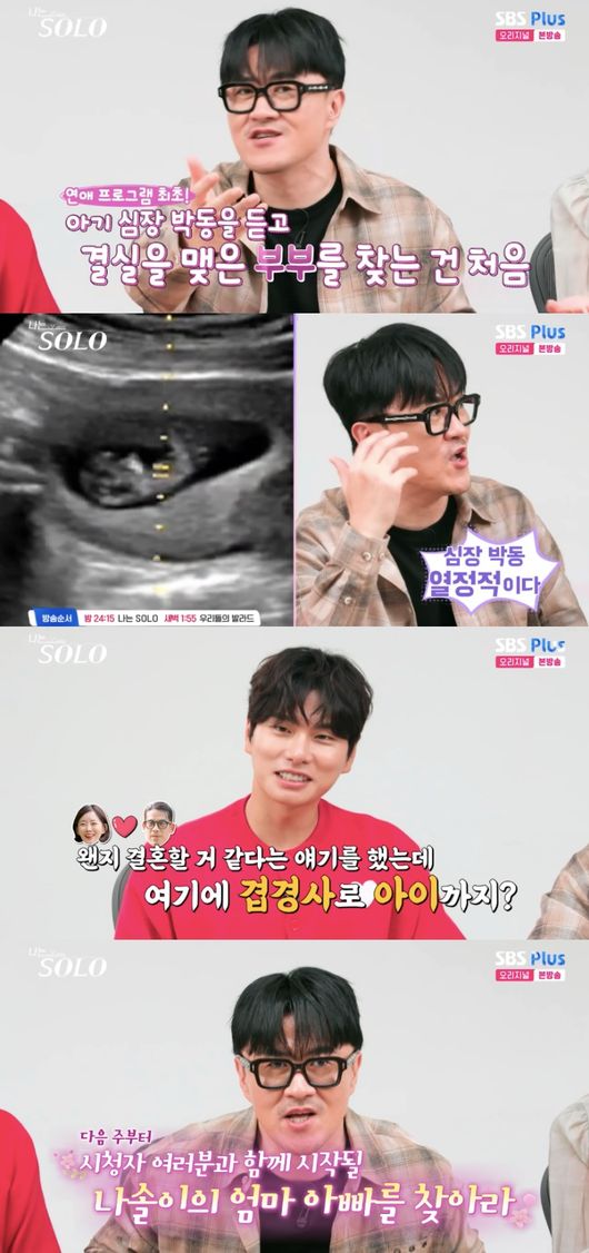 또 MC들은 옥순, 정희, 광수, 영호 등 추측에 나섰고, 흥분한 데프콘은 “시청자 여러분들 그동안 저희가 결혼 커플에 대한 힌트는 드렸는데 아기 심장 박동 듣는 건 처음이다. 결실을 맺은 커플을 찾아야 한다”라고 말했다.