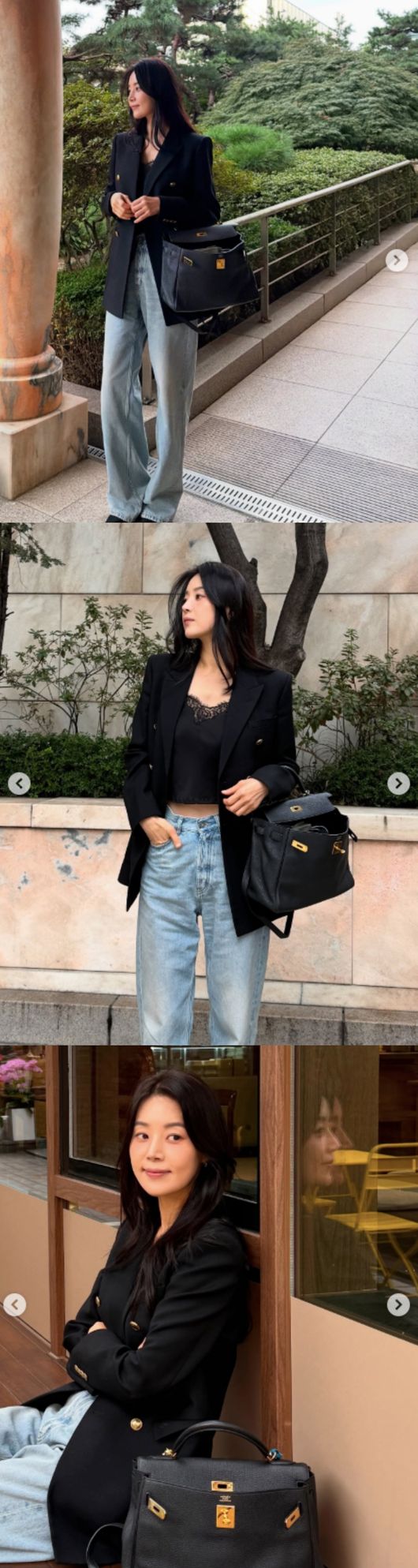 사진 속 한지혜는 블랙 더블 자켓에 레이스 슬립 탑, 연청 데님을 매치해 세련된 데일리룩을 완성했다. 여기에 블랙 토트백을 더해 클래식하면서도 우아한 분위기를 자아낸 모습이 담겼다.
