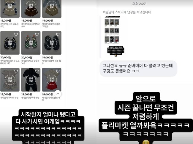 그러나 얼마 지나지 않아 제이쓴은 "시작한지 얼마나 됐다고 다 사가시면 어떻게 해요 ㅋㅋㅋㅋ"라며 제이쓴이 내놓은 아들 준범이의 옷이 모두 판매 완료됐음을 인증했다.