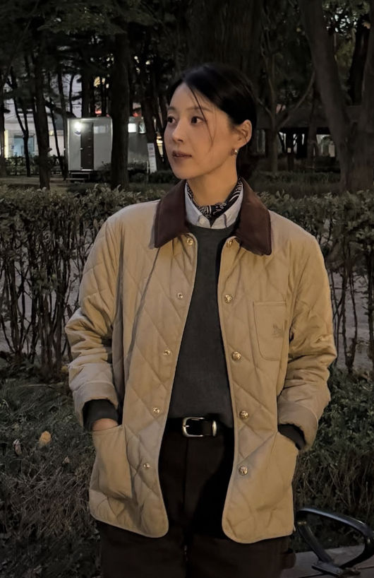 정점은 그가 셔츠 안에 포인트를 준 방도 스카프이다. 검정 바탕에 기하학적 무늬가 세련되게 그려진 검정 스카프는 이 모든 코디에서 조용히 시선을 끌고 있다. 한지혜는 자신의 깔끔한 이미지만큼 단아한 귀걸이와 함께 외투는 퀄팅 베이지 패딩을 들고 있음으로 가을 코디를 완성했다.