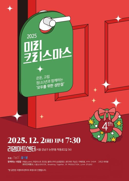 올해로 네 번째를 맞는 이번 행사는 특히 은둔·고립 청소년·청년을 돕는 단체 ‘더 유스’와 함께하며, 이들을 직접 초대해 함께 성탄의 기쁨을 나누는 시간으로 진행된다. 더 유스 김재열 대표는 “홀로 외롭게 지내는 친구들에게 따뜻한 시간이 되기를 기대한다”고 말했다.