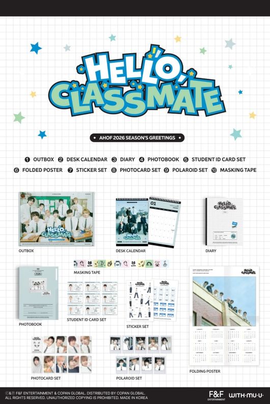 아홉(AHOF·스티븐, 서정우, 차웅기, 장슈아이보, 박한, 제이엘, 박주원, 즈언, 다이스케)은 지난 18일 오후 공식 SNS 채널을 통해 'AHOF 2026 SEASON'S GREETINGS [Hello, Class Mate]' 예약 판매를 시작했다.
