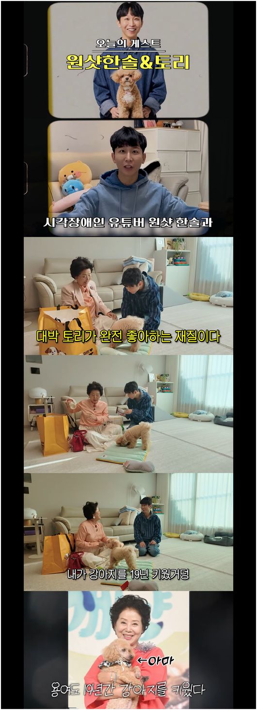이날 선우용여는 시각장애인 유튜버 한솔을 만났다. 최근 한솔은 기가 막힌 천재견으로 유명한 반려견 토이와 함께 그의 집에서 선우용여를 반겼다. 영특한 토이의 열렬한 몸짓에 선우용여는 넋을 빼며 강아지에게 한껏 매료된 표정을 지었다. 그러면서도 엄격하게 토이를 훈육하는 모습은 반려견을 길러 본 사람의 몸짓이었다. 토이는 선우용여를 몹시 좋아했고, 한솔은 "얘가 원래 이렇게까지 안 하는데"라며 놀라워했다.