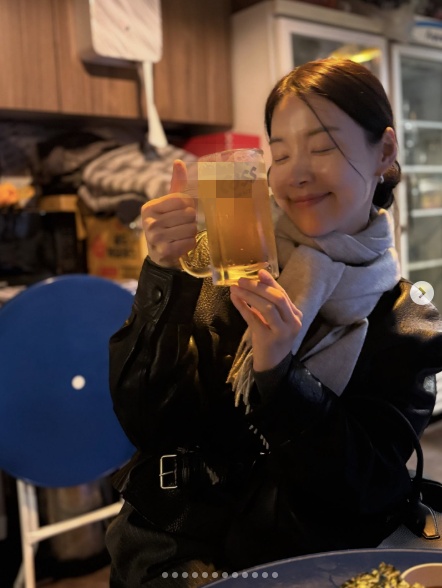 사진 속 한지혜는 따뜻한 조명 아래 맥주잔을 들고 환하게 눈을 감은 채 미소 짓고 있다. 편안한 차림에도 그는 빛나는 피부와 청순한 분위기를 자아낸 모습.