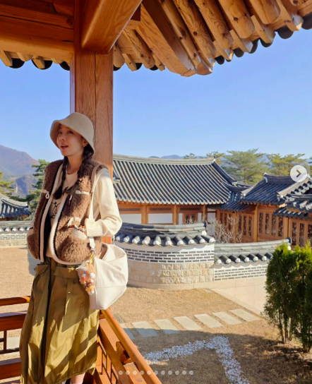 사진 속 소유진은 전통 한옥을 배경으로 편안한 차림을 한 채 따스한 미소를 짓고 있다. 니트 버킷햇과 양털 베스트를 매치한 스타일링은 계절 분위기와 어우러지며 감성을 더한 모습.