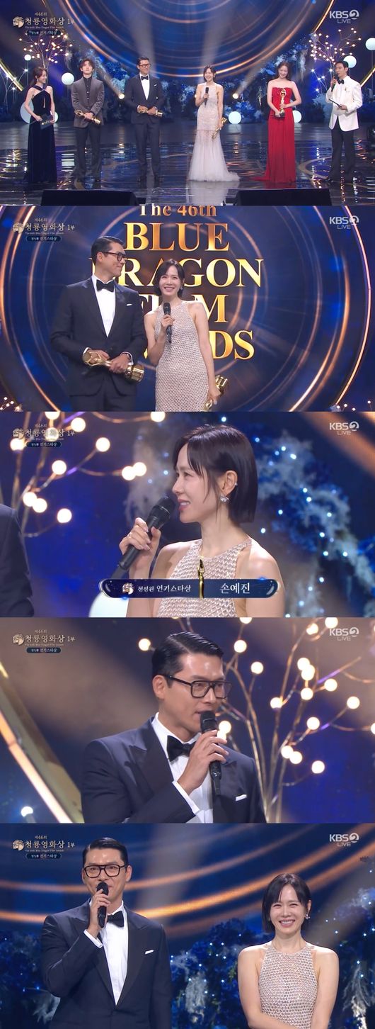 배우 현빈, 손예진 부부가 46회 청룡영화상에서 청정원 인기스타상을 동반 수상했다.