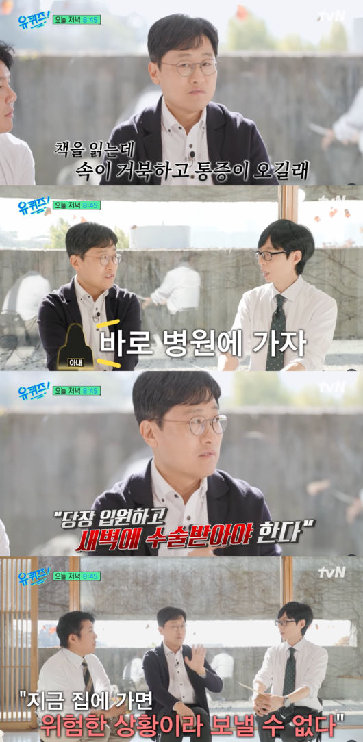 결국 추석 연휴에 상태가 급격히 나빠졌다. 김 교수는 “추석 때도 몸이 안 좋았는데 밤 11시쯤 심하게 안 좋아지고 속이 거북하며 통증이 왔다”고 회상했다. 평소 “내일 가자”는 스타일이던 아내가 “지금 바로 병원에 가자”고 강하게 권했고, 마지못해 향한 병원 응급실에서 곧바로 입원과 응급 수술이 필요하다는 진단이 내려졌다.