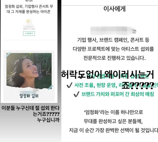 공개된 캡쳐 사진에는 '엄정화 섭외, 기업행사 콘서트 무대 그 자체를 완성하는 아이콘'이라는 제목 아래 엄정화를 섭외 가능하다며 "기업 행사, 브랜드 캠페인, 콘서트 등 다양한 프로젝트에 맞는 아티스트 섭외를 전문적으로 진행하고 있다. 엄정화라는 이름 하나만으로 무대를 완성하고 싶은 분들께 지금 이 순간 가장 완벽한 선택이 될 것이다"라는 글을 적혀 있어 눈길을 끌었다.