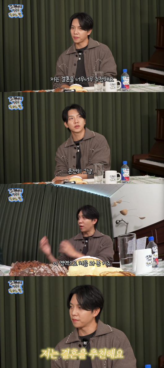 이날 조현아는 이승기에 “결혼하고 나서 삶이 어떤지?”아고 물었고, 이승기는 “저는 결혼을 너무 너무 추천한다. 결혼을 할 것 같고, 혹은 하고 싶은 나이대가 있었다. 그게 36세부터 39세 그 사이였다”고 밝혔다. 이승기는 “온전히 그냥 이승기로서. 연예인을 직업으로 두고, 삶은 따로 있고. 이 영역으로 처음 와 본 거다. 근데 제가 해보니 저는 결혼을 너무너무 추천한다”고 말했다.