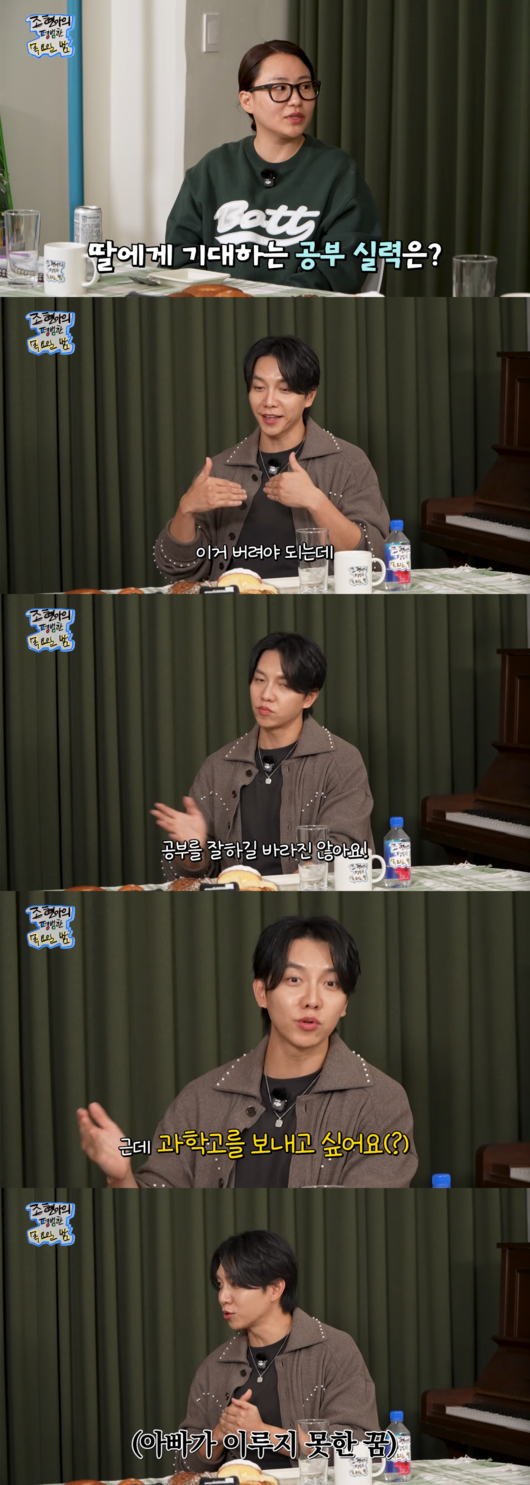 이에 이승기는 “따님 있죠. 아 따님이래”라며 “딸이 있죠”라고 웃었다. 조현아는 딸에게 기대하는 공부 실력을 물었고, 이승기는 “이거 버려야 되는데, 공부를 잘하길 바라진 않는다. 근데 과학고를 보내고 싶어요”라고 말해 현장을 빵 터지게 했다. 이승기는 “나의 투영, 내가 고등학교 때 특목고를 가보고 싶었다. 외고를 너무 가보고 싶었는데, 못가서..”라고 말했다.