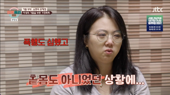 이날 공개된 아내측 영상에서, 아내는 남편으로부터 겪은 엄청난 폭행에 대해 어렵게 입을 열었다. 아내는 "홑몸도 아니었던 상황에, 폭행도 심했고"라고 말하며 시청자들을 충격에 빠뜨렸다.