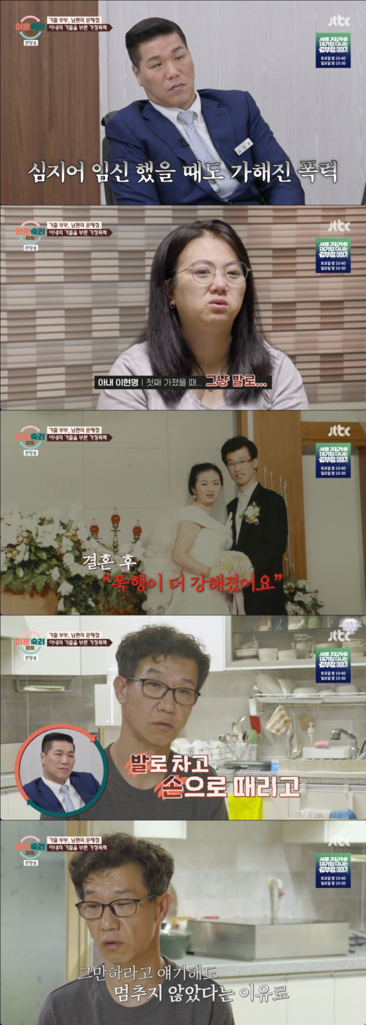 아내는 가장 충격적이었던 폭행 상황을 구체적으로 설명했다. 바로 "첫째 가졌을 때 그냥 발로 (찼다)"는 것. 임신 상태인 아내에게도 무자비한 폭력을 가했다는 사실에 스튜디오는 경악을 금치 못했다.
