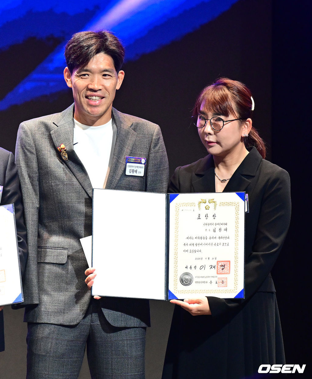 대한민국체육상 장애인경기상을 수상한 김황태 선수가 아내 김진희 씨와 기념촬영을 하고 있다. 2025.11.21 / dreamer@osen.co.kr