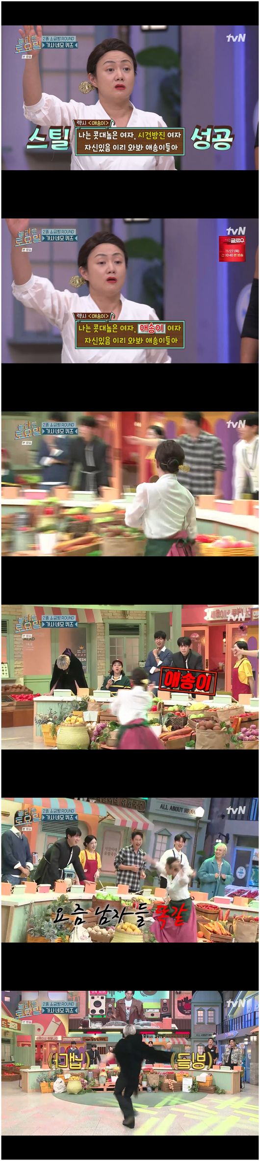 특히 김동현은 “이홍기가 ‘사랑앓이’를 불러주시면 좋겠다. 이것도 사연이 있다. 제가 아내에게 고백을 할 때 뒤에 있던 가게에서 이 노래가 흘러 나왔다”라며 말도 안 되는 사연을 제공하며 노래를 신청했다가 도리어 노래를 부르게 됐을 때, 그는 김동현과 함께 '사랑앓이'를 불러 시선을 끌었다. 또한 유준상은 받쓰 게임에서 결정적인 단어를 맞혔으며, 간식 게임에서도 상위권으로 가사를 맞히며 90년대 댄스를 춘 후 간식을 획득해 분위기를 확 띄웠다./osen_jin0310@osen.co.kr