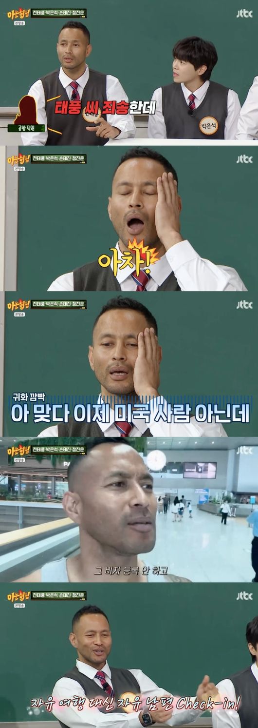 신동은 “다 같이 미국 여행 가다가 태풍이만 못 갔냐”라고 물었고, 전태풍은 “공항 가서 내 여권을 냈는데 비자가 없다더라. 아차 싶었다. 귀화한 것을 깜빡했다”라고 답했다. 전태풍은 “코로나 때부터 5년 동안 미국을 안 가서 깜빡했다”라고 덧붙였다.